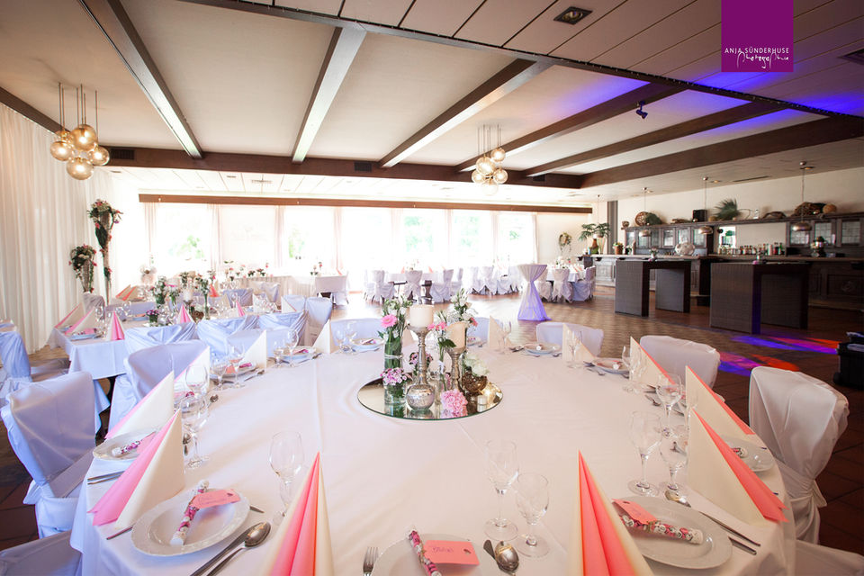 Unser Festsaal bietet Platz für bis zu 300 Personen. Für kleinere Veranstaltungen kann der Saal abgeteilt werden. Durch den hinteren Saalausgang gelangt man direkt in den traumhaft angelegten Garten. Der knapp 7000qm große Garten mit Bachlauf und Teichanlage ist ein beliebter Platz für den Sektempfang unter blauem Himmel, freie Trauungen oder als Hintergrund für die Hochzeitsbilder.